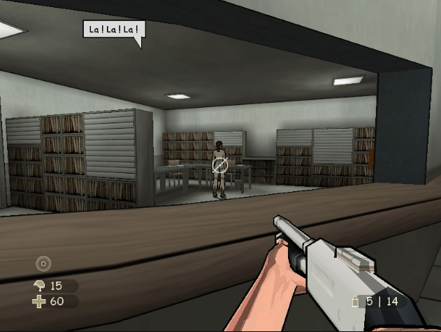 Well, XIII has a truckload of that; especially the kind of goofy humour that would be kicked straight out of any other modern military shooter for the crime of ruining the serious, self-important mood. If you take the stealthy route, you can always overhear some ridiculous conversations that either offer background on your current mission, or are just there for the sake of fun. When you infiltrate a military base early in the game, you can overhear two guards talking about how their boss, Colonel McCall, had a low-level grunt institutionalized at Plain Rock Mental Asylum just for calling him a pinhead, and halfway through the game, when you end up at Plain Rock yourself, you meet a clearly insane inmate in military uniform who alternates between broken crying and laughing “Pinhead, pinhead, McCall is a pinhead!” to himself, which is not only some nice foreshadowing/a call back, but also immediately lets you know that Colonel McCall is a bad boss with a short temper, and Plain Rock is definitely not a good place to be.