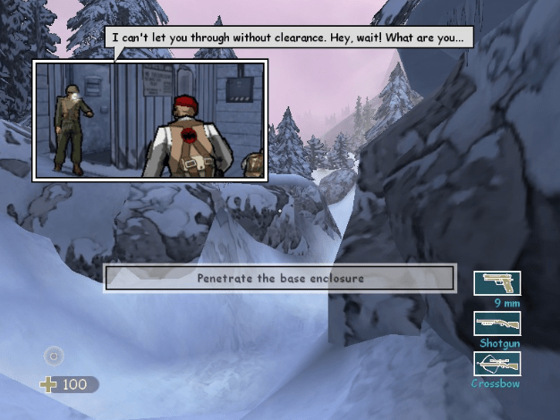 And helping to cover up for the game’s honestly not hugely-impressive graphical quality was the decision for XIII to use cel-shading. It’s clear from the start that this isn’t exactly The Wind Waker, but XIII has aged phenomenally compared to other games of the era, because the cel-shading and the stylized design make every environment pleasant to see, and even more pleasant to run through with a shotgun, blasting everything in sight, or crouch-walk through with a crossbow if you are so inclined. It might start to look a little janky and dated in some of the screenshots I’ve taken, but I assure you, the game is remarkably smooth to play through and enjoyable to look at.