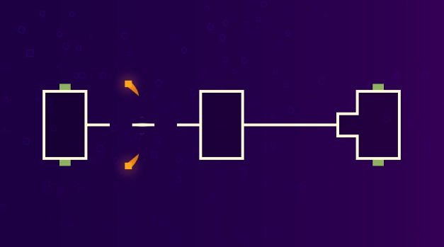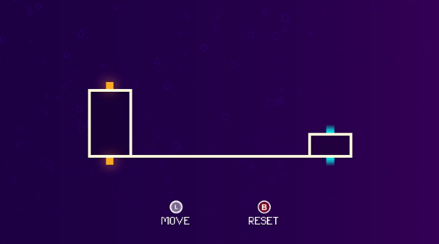 Ah! Now we introduce a second mechanic; bouncing! When only one platform separates the blocks, and they come into contact with each other, the force of one block colliding with a platform will send the respective block (as long as it’s lined up in roughly the same spot) flying through the air for a short while, after which it will return and collide with the platform again, sending the other block flying through the air, and so on and so forth until they find themselves unaligned again, usually because the block flying through the air will have more freedom to go in a particular direction than its stationary counterpart. Still nothing too difficult though.