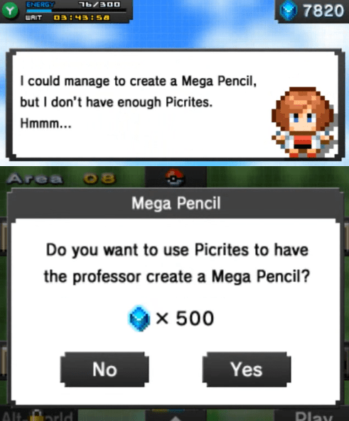 Or why not spend some more Picrites to raise your maximum stylus energy to 200? It only costs 50 Picrites! And then another 100 Picrites to get to a maximum of 300 energy. And then 150 Picrites to get to 400. Then you can spend a whopping 400 Picrites, but this gives you unlimited stylus energy, so you can play the game for as long as you like! Until you need to advance to the next area, as you’ll probably be bankrupt by then. So just to clarify, you need to spend 700 Picrites in order to unlock the ability to permanently be able to play the game. Outstanding.