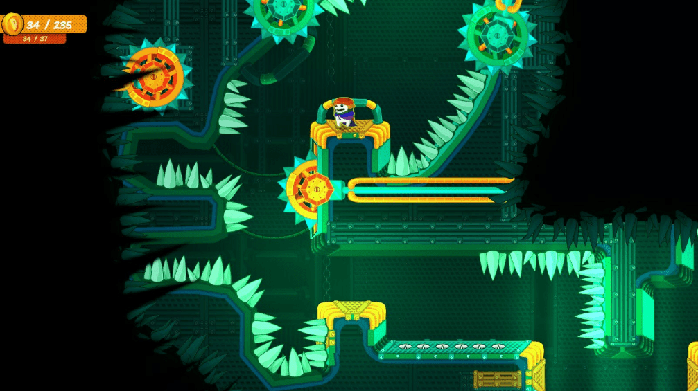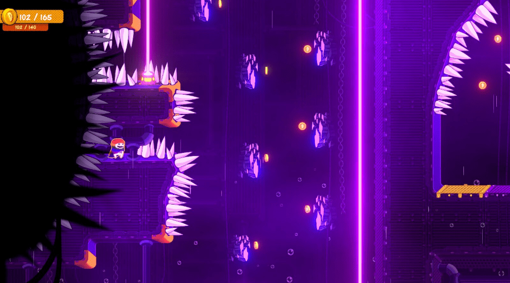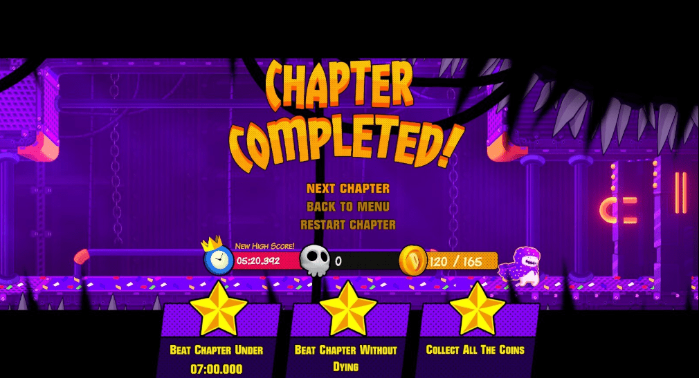 And blast through it you shall, because Sockventure is perfect for speedrunning. Every level has the same two achievements for beating the whole thing deathless, and beating it under a certain time. On your first time playing through, you will struggle at both, but especially the time limit. I replayed the first level several times, wondering how on earth I was supposed to reach the end in under three minutes, before eventually giving up and moving on… and realising shortly after Chapter Four ‘Oh… I was supposed to wait until I had the air-dash and double-jump, wasn’t I?’ And yes, I was, because they completely trivialize many of the early-game obstacles.