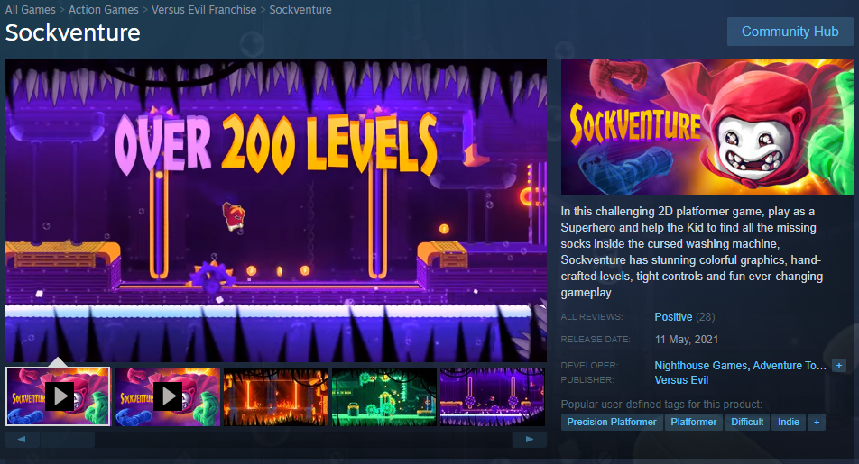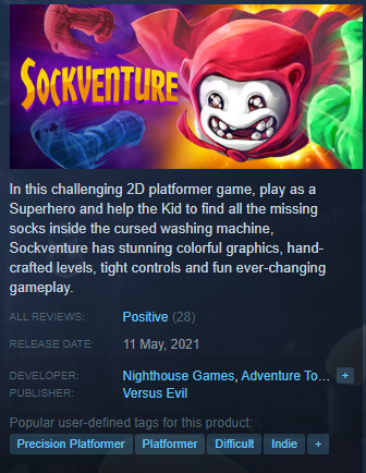 So with that in mind… buy Sockventure, please! Or add it to your wishlist and wait for it to go on sale. If you liked Celeste or Super Meat Boy, you have to give this a shot. If you like supporting clearly very talented indie developers who can only make the scene a better and more exciting place, you also have to give this a shot. And hell, if you just like good video games, you owe it to yourself to try this one out.