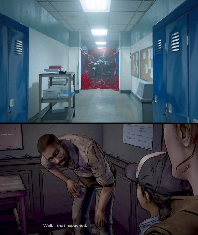 You can help Pete at the end of Episode One, but he’ll die regardless at the start of Episode Two. You get the choice to save Nick in Episode Two. If you do, he gets two lines in Episode Three, no-one even acknowledges his presence, and he’s hit by a stray bullet and dies off-screen, and you stumble across him as a Walker in Episode Four. You can get Alvin killed in Episode Two, but if you don’t, he dies anyway in Episode Three. You can save Sarah in Episode Four, but she dies… TEN MINUTES LATER in Episode Four. I cannot stress enough how genuinely fucking terrible this writing is. And I don’t entirely blame the writers; Telltale Games operated on a system of crunch time and last-minute rewrites and according to interviews with former employees, one of the creative directors had the following quote printed out on paper and taped to his door. “It’s not about how much time you need to make a good game, it’s about how good of a game you can make with the time you have.” I honestly think that a literal giant red flag would have been less of a red flag than that statement.