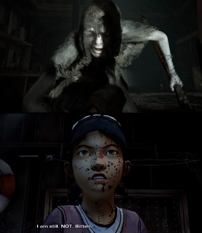 I’ve tried ranking all four of these games in my head to see if I could measure some numerical, objective-looking rank to prove which is worse, but I think that ultimately the decision comes down to the gameplay. Outlast II and Outlast have similar enough gameplay – Outlast II is definitely a little worse – and the story and tone being a load of old crap doesn’t really detract from that. The Walking Dead: Season One shares the same gameplay as Season Two, but… the gameplay is really entirely centred around the story. Nobody plays… played a Telltale Games production for the gameplay and not the story. So I think Outlast II represents less of a drop in quality, because while the tone and the plot changed, everything else remained mostly the same… and it still sucks because of it, but less so than something that was almost entirely dependent on plot and tone to succeed. Both games are huge step-downs in terms of quality, but The Walking Dead: Season Two is more of a step-down, I feel.