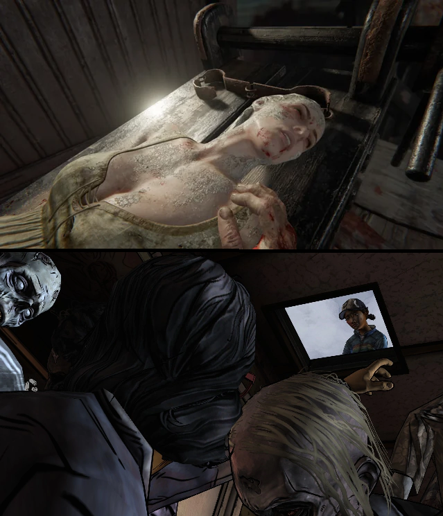 Sarah watches her father get shot and then devoured by walkers, and panics and runs away. Clementine later finds her, trapped in a room surrounded by more walkers, basically shell-shocked and incapable of even recognizing the situation that she’s in. You end up escaping through a skylight and have the option to save her – although you do have to slap her to get her attention – or you can leave her to die, at which point she seems to regain her understanding of the situation just before she’s also devoured by walkers, while screaming for your help. And the worst part is, because she can die, you now know that she will. And sure enough, if you saved her, then she rejoins the group, but later everyone is hiding on a raised deck, which collapses, trapping Sarah underneath rubble, where she is also devoured by walkers, screaming for help from her deceased father.